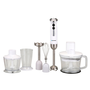 Botmixer szett teljesítmény: 1000W, DC motor, 4 szárú pengék titán bevonattal, levehető rozsdamentes acél keverő rúd, sebességszabályozás, szeletelő, habverő, pürésítő, aprító és műanyag edény