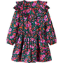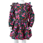 Ez a gyerekruha hosszú ujjú, kerek nyakkivágással rendelkezik, és a nyakánál gombbal záródik. A csinos fodrok és az egész virágmintás a ruhát elegánssá és gyönyörűvé varázsolják. A rövid gyerekruha puha anyagból készült, amely 95% pamutot és 5% elasztánt tartalmaz a kényelem és a légáteresztés érdekében.