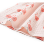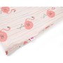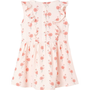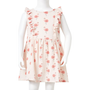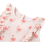 Ez a gyerekruha kerek nyakkivágással rendelkezik, a nyakánál pedig gombokkal záródik. Ez a halvány rózsaszín gyerekruha gyönyörű fodrokkal rendelkezik, amelyek elölről felfutnak az ujjakig. Ezt a ruhát teljes felületén flamingók borítják. A rövid gyerekruha puha anyagból készült, amely 100% pamutot tartalmaz a kényelem és a légáteresztés érdekében.