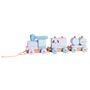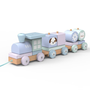 Egy gyönyörű fából készült vonat blokkokkal, állatok képeivel. Három kocsiból áll, mindegyiken két rúd található, amelyeken geometriai blokkok alkalmazhatók. A vonat fel van szerelve egy zsinórral, amelynek köszönhetően a gyermek húzhatja, és kirándulhat a szobában.