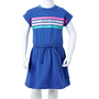 Ez a gyerekruha kerek nyakkivágással, rövid ujjú, felvarrt felhajtással, és húzózsinóros derékpánttal rendelkezik. Ezt a gyerekruhát különböző színű csíkok díszítik a mellkasán. A rövid gyerekruha puha anyagból készült, amely 95% pamutot és 5% elasztánt tartalmaz a kényelem és a légáteresztés érdekében.