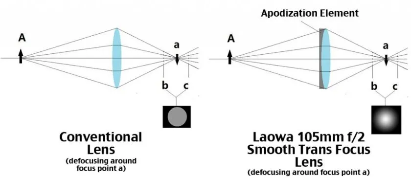 A LAOWA 105 mm f/2 sima Trans Focus objektív egyedi optikai kialakítással rendelkezik, amelyben egy apodizációs (APD) elem található a rekesz mellett. Az APD elem egy ND szűrő funkciójához hasonlít, amely a külső szél felé vastagodik, fokozatosan csökkentve a fényáteresztést a periféria felé, így lágy, természetes és gyönyörűen szórt, fókuszon kívüli képalkotást (vagy „bokeh”-t) hoz létre.