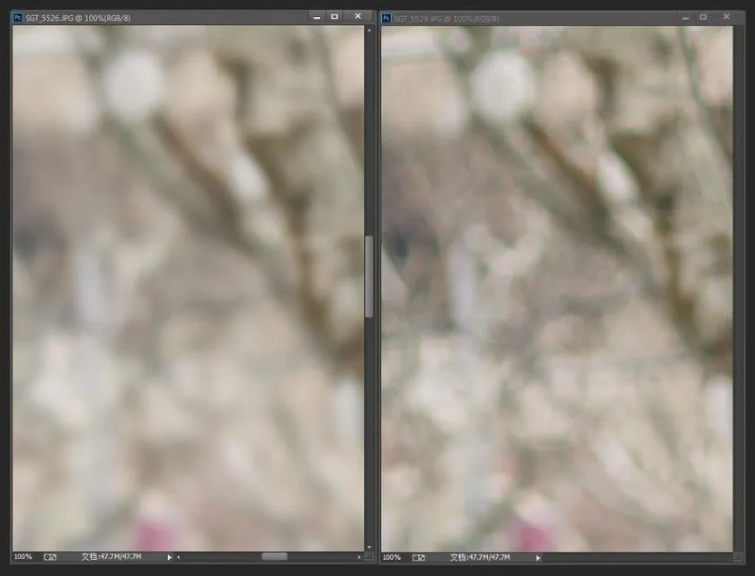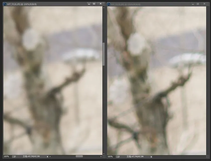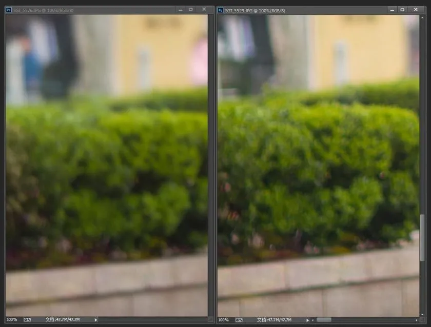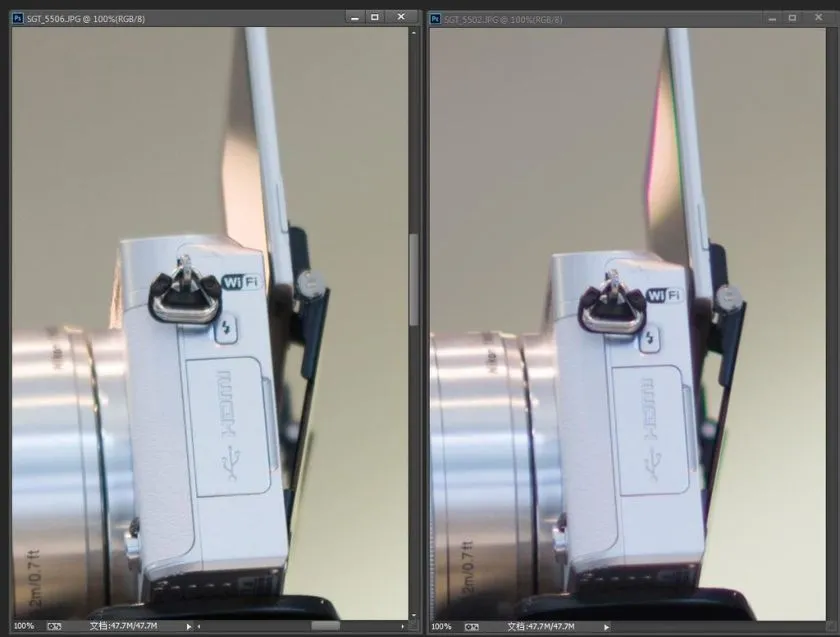 Kromatikus aberráció összehasonlítása 100%-os kivágásnál (balra: Laowa, jobbra: mások). Nézd meg a lila szegélyt a jobb oldali képen.