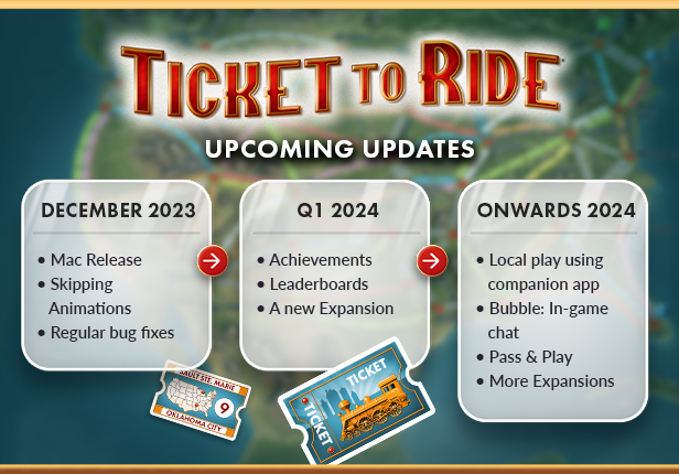 Csatlakozz a Discord-hoz, és találkozz a vasút úttörőivel. Legyen az első, aki értesül a kiadásokról, frissítésekről, versenyekről és eseményekről. Ismerd meg a Marmalade Game Studio csapatát, a hivatalos Monopoly, Clue, Game of Life 2 és még sok más alkotóit mobilon, PC-n és konzolon! A Ticket to Ride meglévő rajongói kulcsszerepet játszottak a játék kialakításában és funkcióinak inspirációjában, mi pedig elköteleztük magunkat a kapcsolat erős megőrzése mellett!